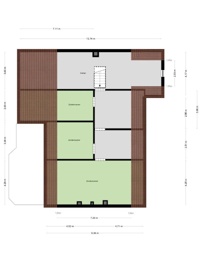 De garage biedt toegang tot de immense zolder. Het gelijkvloers heeft volgens EPC een oppervlakte van 199 m2, samen met de zolder heeft de woning ruim 285 m2 bewoonbare ruimte.
