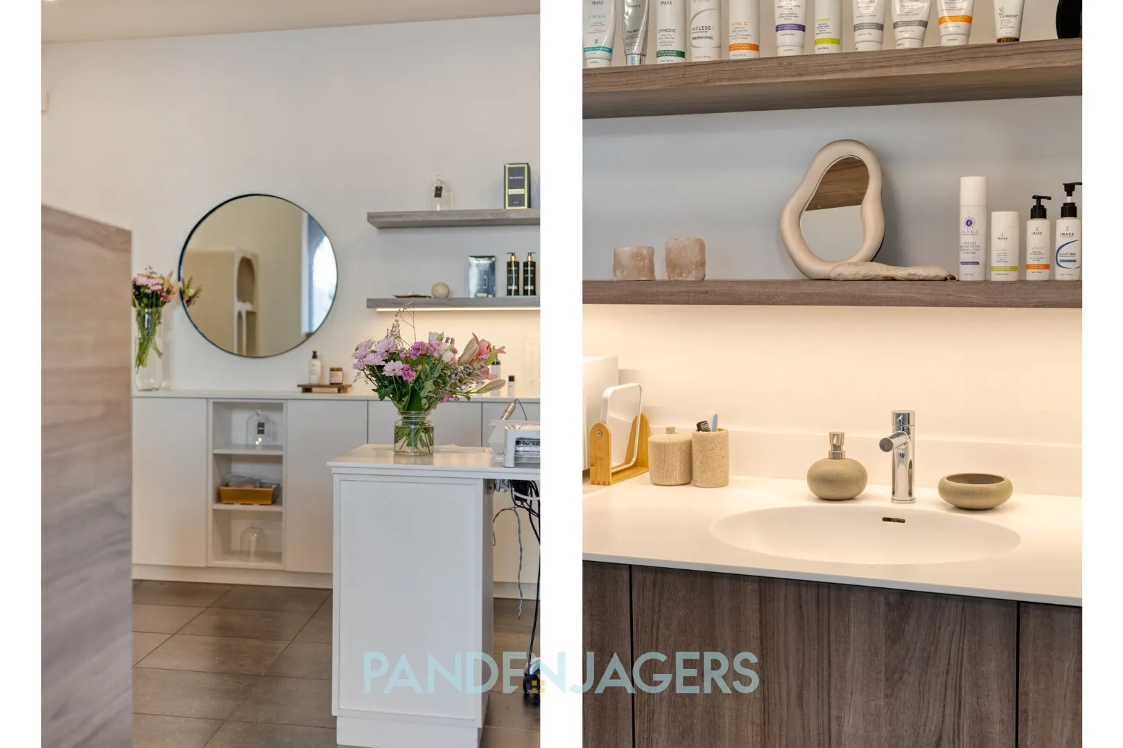 Bij het binnenkomen wordt u verwelkomd door een prachtige op maat gemaakte balie. Rechts bevindt zich een open, lichtrijke ruimte met tal van mogelijkheden. Daarnaast is er een aparte, afgesloten ruimte voorzien met maatkasten en een lavabo, ideaal voor behandelingen of als praktijkruimte.