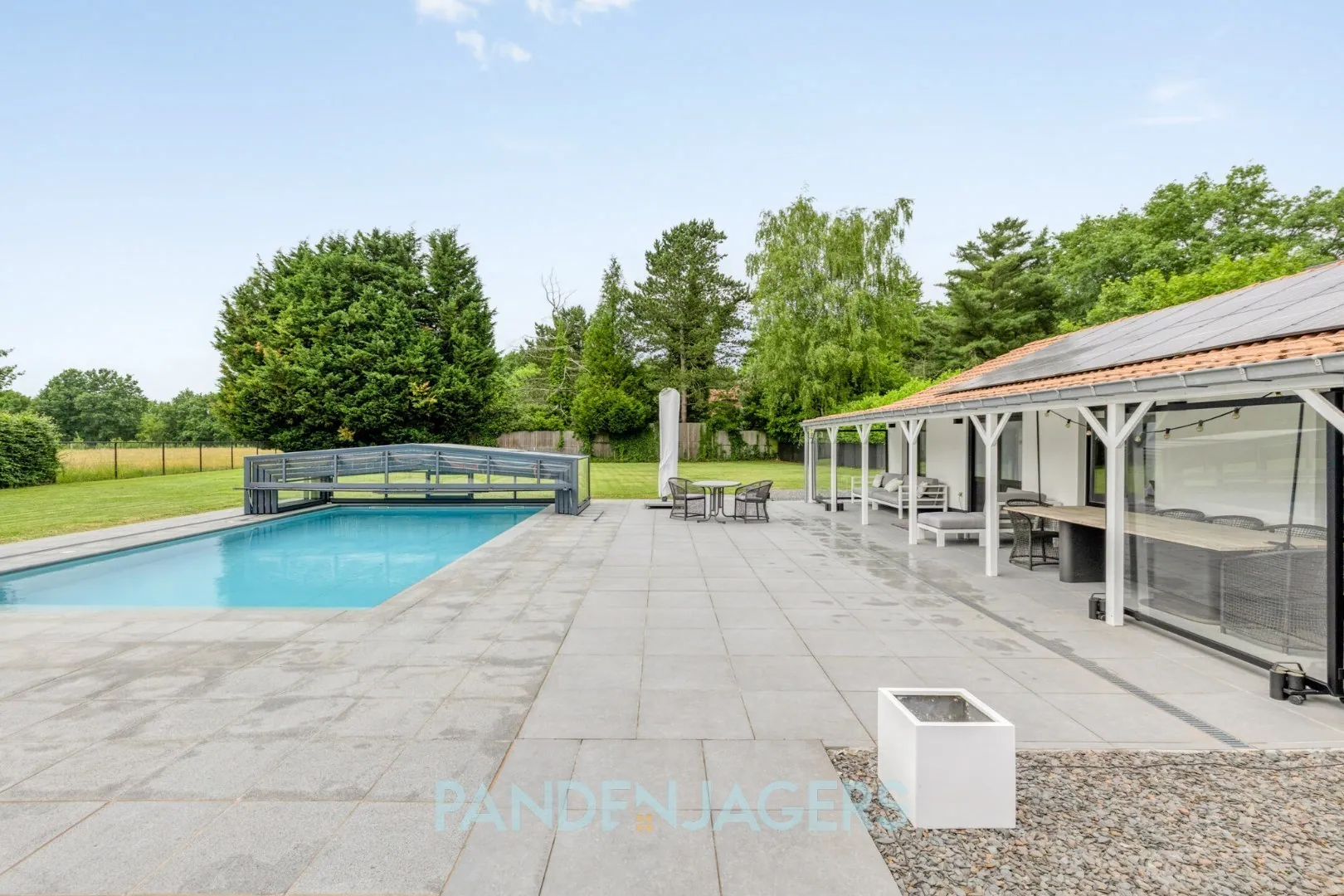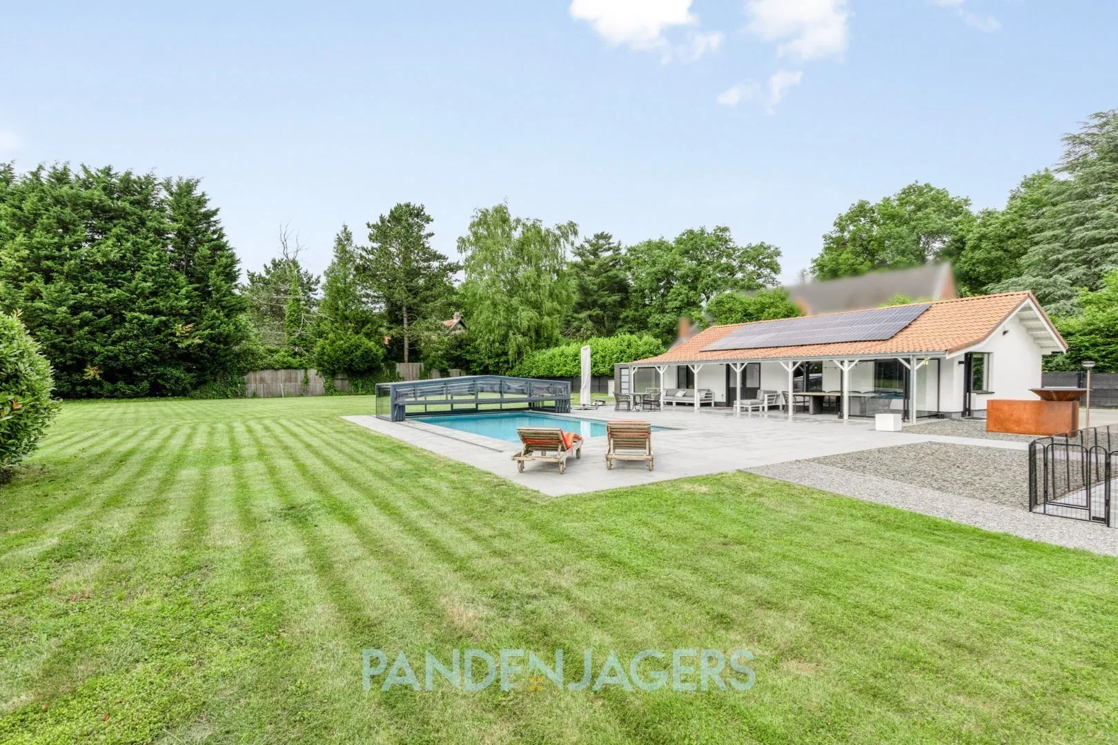 Buiten ligt er in de tuin van meer dan 2600 m2 een verwarmd zwembad met een mobiele overkapping. Bovendien is er een poolhouse van zo'n 84 m2 groot, waarin onder meer nog een extra keukentje en badkamer voorzien is en waar er ruimte is voor minstens 1 extra slaapkamer.