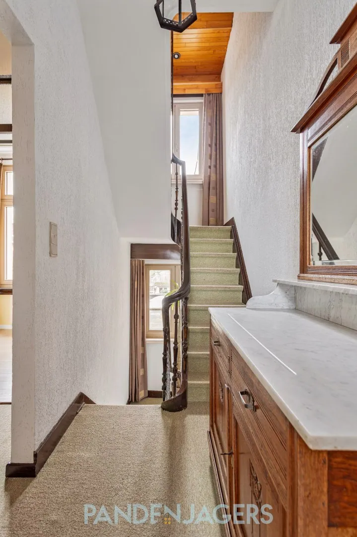 Bij het binnenkomen in de inkomhal vallen de mooie, hoge plafonds op. De grote ramen van de woonkamer zorgen voor veel lichtinval. Deze ruimte staat in verbinding met de eetplaats en de moderne leefkeuken. Achteraan de woning is er nog een extra veranda met berging en toilet. Op de eerste verdieping zijn er 2 slaapkamers en een moderne badkamer. De tweede verdieping heeft nog eens extra 2 slaapkamers en een toegang naar de geïsoleerde bergzolder. Er is bovendien een ruime, zuidgerichte en dus zonnige tuin.