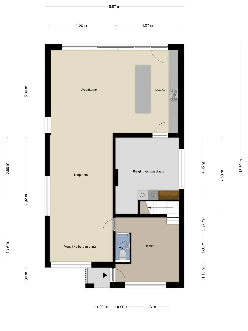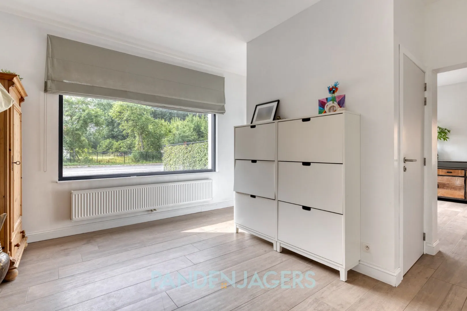 Bij het binnenkomen valt al meteen de ruime inkomhal met afzonderlijk gastentoilet op. Van de leefruimte werd een groot, open geheel gemaakt. Aan de voorkant is er de mogelijkheid om een royale bureauruimte voorzien, de eetplaats is dan weer voldoende ruim om er een tafel met 8 of 10 stoelen te voorzien. De eyecatcher is ongetwijfeld achteraan de woning, waar de woonkamer en hypermoderne open keuken dankzij de enorme ramen in conncetie staan met de tuin. Verder is er hier nog een ruime berging met wasplaats.